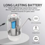 - LONG USE TIME + USB CHARGING: The water bottle pump charges via USB cable and will last 30-40 days or approximately 4-6 5-gallon bottles of water on a full charge. LED light will be in solid red when charging, and will be off when fully charged.