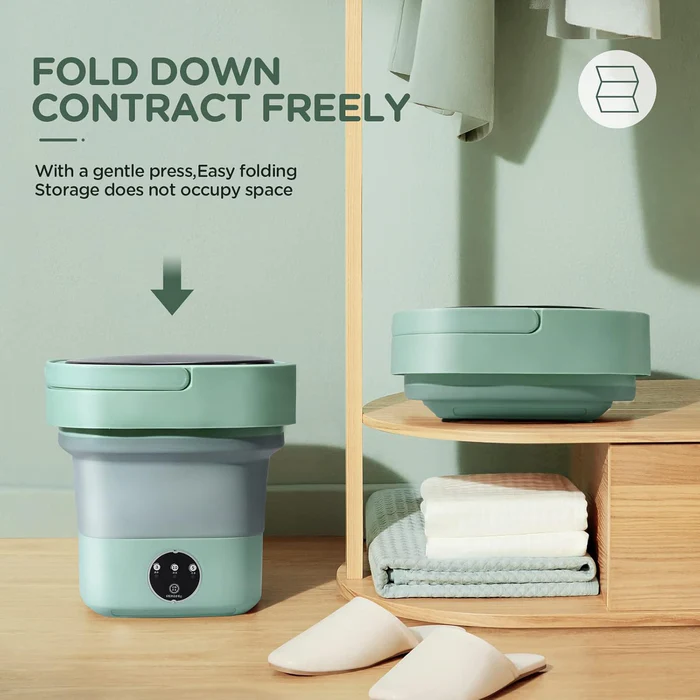- Space-saving and portable: our mobile washing machine can be folded and stored to save space. With a capacity of 8 liters, the washing process is quiet (<65 dB) and saves water, energy and time. Perfect for on the go, dormitories, caravans and camping.