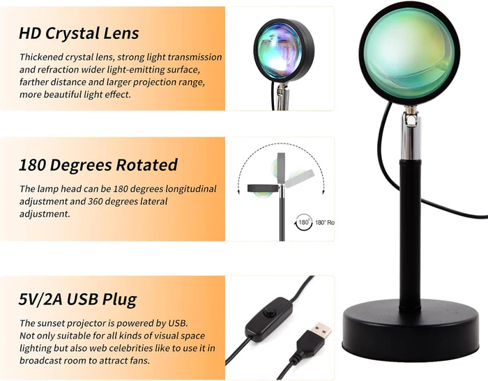 - 💕【180 Degree Rotation】 You can take this LED lamp anywhere since it is portable. The sunset lamp head can be rotated 180 degrees, can produce different lights from different angles, creating a brilliant atmosphere, enjoy the beauty of the sunset.